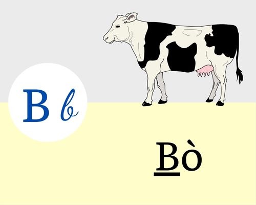 ອັກສອນຕົວນີ້ອ່ານວ່າ: B [ເບີ່] ຖ້າທຽບກັບຕົວອັກສອນໃນພາສາລາວແມ່ນຈະຄືກັບຕົວ ບ. ຢູ່ໃນນີ້ຈະອ່ານ ແລະອອກສຽງທັງໝົດວ່າ: B-bò[ເບີ່-ບໍ່]. Bò[ບໍ່] ມີຄວາມໝາຍວ່າ: ”ງົວ”. ຕົວອັກສອນ B [ເບີ່] ນີ້ຈະເປັນໄດ້ແຕ່ພະຍັນຊະນະຢ່າງດຽວ.