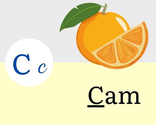 ອັກສອນຕົວນີ້ອ່ານວ່າ: C [ເກີ່] ຖ້າທຽບກັບຕົວອັກສອນໃນພາສາລາວແມ່ນຈະຄືກັບຕົວ ກ. ຢູ່ໃນນີ້ຈະອ່ານ ແລະອອກສຽງທັງໝົດວ່າ: C-cam[ເກີ່-ກາມ]. Cam[ກາມ] ມີຄວາມໝາຍວ່າ: ”ໝາກກ້ຽງ”. ຕົວອັກສອນ C [ເກີ່] ນີ້ເປັນໄດ້ທັງພະຍັນຊະນະ ແລະ ຕົວສະກົດຄືກັບຕົວ ກ ໃນພາສາລາວ.