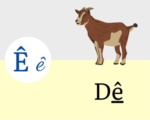 ອັກສອນຕົວນີ້ອ່ານວ່າ: Ê[ເອ] ເປັນສະຫຼະ Ê[ເອ] ໃນພາສາຫວຽດ, ຖ້າທຽບໃສ່ພາສາລາວແມ່ນສຽງຫຼະສະ ເ×. ຢູ່ໃນນີ້ຈະອ່ານ ແລະອອກສຽງທັງໝົດວ່າ: Ê-dê[ເອ-zea]. Dê[zea] ຫຼື Dê[ເຢ] ມີຄວາມໝາຍວ່າ: ”ແບ້” . ສະຫຼະ Ê[ເອ] ນີ້ເວລາເອົາໄປປະກອບກັບພະຍັນຊະນະຈະໃສ່ຕົວສະກົດ ຫຼື ບໍ່ໃສ່ ກໍ່ໄດ້ຂື້ນກັບຄຳສັບນັ້ນໆ. ຕົວຢ່າງ: mê [ເມ], tên [ເຕນ],…