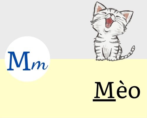 ອັກສອນຕົວນີ້ອ່ານວ່າ: M[ເມີ່] ຖ້າທຽບກັບຕົວອັກສອນໃນພາສາລາວແມ່ນຈະຄືກັບຕົວ ໝ, ມ. ຢູ່ໃນນີ້ຈະອ່ານ ແລະອອກສຽງທັງໝົດວ່າ: M-mèo[ເມີ່-ແມ່ວ]…. Mèo [ແມ່ວ] ມີຄວາມໝາຍວ່າ: ”ແມວ (ໂຕແມວ)”. ຕົວອັກສອນ M[ເມີ່] ນີ້ເປັນໄດ້ທັງພະຍັນຊະນະ ແລະ ຕົວສະກົດໄດ້ຄືກັບຕົວ ມ ໃນພາສາລາວ.