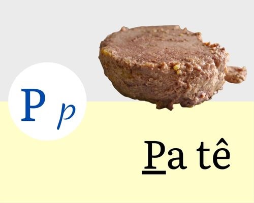 ອັກສອນຕົວນີ້ອ່ານວ່າ: P[ເປີ່] ຖ້າທຽບກັບຕົວອັກສອນໃນພາສາລາວແມ່ນຈະຄືກັບຕົວ ປ. ຢູ່ໃນນີ້ຈະອ່ານ ແລະອອກສຽງທັງໝົດວ່າ: P-patê[ເປີ່-ປາເຕ]… Patê[ປາເຕ] ມີຄວາມໝາຍວ່າ: ”ປາເຕ່”. ຕົວອັກສອນ P[ເປີ່] ນີ້ຈະມີຄວາມແຕກຕ່າງໜ້ອຍໜຶ່ງ ເພາະວ່າ: ເວລາເປັນພະຍັນຊະນະ ຈະຄືກັບຕົວ ປ ໃນພາສາລາວ ແລະ ເວລາເປັນຕົວສະກົດຈະຄືກັບຕົວສະກົດ ບ ໃນພາສາລາວ.