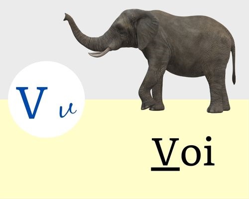 ອັກສອນຕົວນີ້ອ່ານວ່າ: V[ເວີ່] ຖ້າທຽບກັບຕົວອັກສອນໃນພາສາລາວແມ່ນຈະຄືກັບຕົວ ວ. ຢູ່ໃນນີ້ຈະອ່ານ ແລະອອກສຽງທັງໝົດວ່າ: V-voi[ເວີ່-ວອຍ]… Voi[ວອຍ] ມີຄວາມໝາຍວ່າ: ”ຊ້າງ (ໂຕຊ້າງ)”. ຕົວອັກສອນ V[ເວີ່] ນີ້ຈະເປັນພະຍັນຊະນະໄດ້ຢ່າງດຽວ.