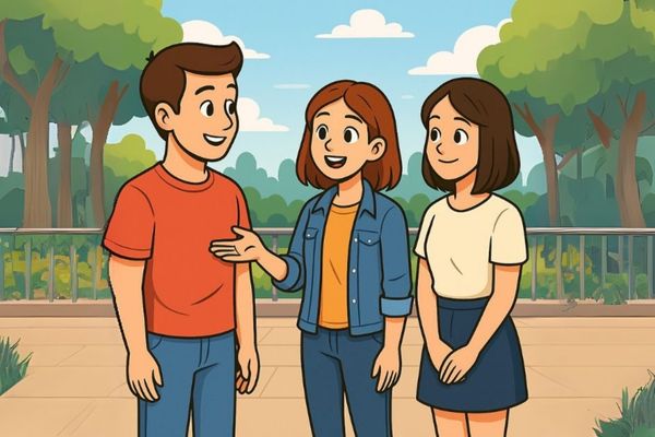 ບົດສົນທະນານີ້ ແມ່ນການສົນທະນາລະຫວ່າງສອງສາວ: ນາ, ລານ ແລະ ດຶກ ເຊິ່ງ ນາ ແລະ ດຶກ ຮູ້ຈັກກັນແລ້ວ, ສ່ວນ ນາ ແລະ ດຶກ ຍັງບໍ່ຮູ້ຈັກກັນ. ເຂົາເຈົ້າພົບກັນຢູ່ລະຫວ່າງທາງ, ເຮົາມາເບິ່ງວ່າເຂົາເຈົ້າຈະທັກທາຍກັນແນວໃດ!
