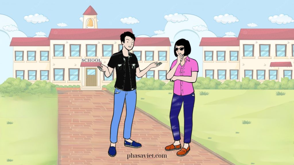 ບົນສົນທະນານີ້ແມ່ນການສົນທະນາລະຫວ່າງ ຮຸນ ແລະ ນິງ. ສອງຄົນນີ້ຫາກໍ່ພົບກັນຄັ້ງແລກຢູ່ໂຮງຮຽນແຫ່ງໜຶ່ງ. ເຮົາມາເບິ່ງວ່າເຂົາຈະທັກທາຍກັນແບບໃດ?